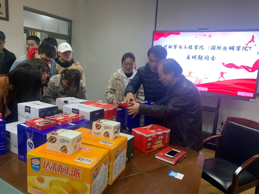 白昼渐短,寒夜愈长,2021年全国硕士研究生招生考试已进入到最后的倒计时,考研学子依旧在为了心中的那份坚持而努力。为了鼓励考研同学积极迎考、舒缓备考压力,完成这场“马拉松”比赛,纺织科学与工程学院(国际丝绸学院)的老师们为考研学子采购了牛奶、巧克力和一些小点心,希望为同学们带来冬日的温暖。