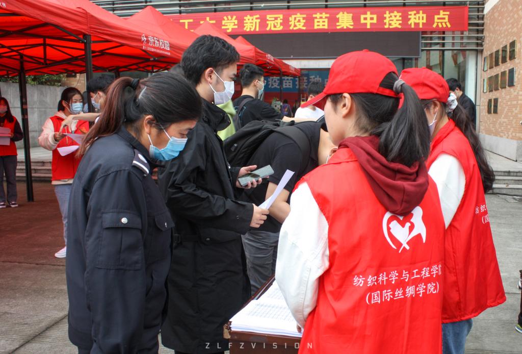 疫苗接种当天,纺织学院辅导员分别在学生活动中心门口预检处、信息输入处、疫苗接种处、接种留观处等各个地点进行值班,组织各年级学生根据课程安排错峰有序地前来接种,并提前做好各项突发事情预案。组织安排各类学生志愿者、学生干部、党员代表分别有序开展疫苗接种过程中分发问卷、学生引导、咨询答疑、秩序维护等服务工作,从细处着手,从实处落地,优化服务师生工作。