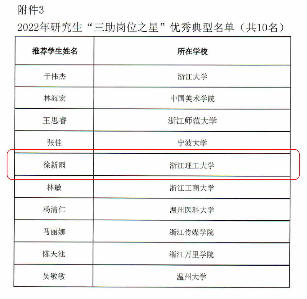浙江理工大学研究生徐新雨获评2022年浙江省研究生“三助岗位之星”