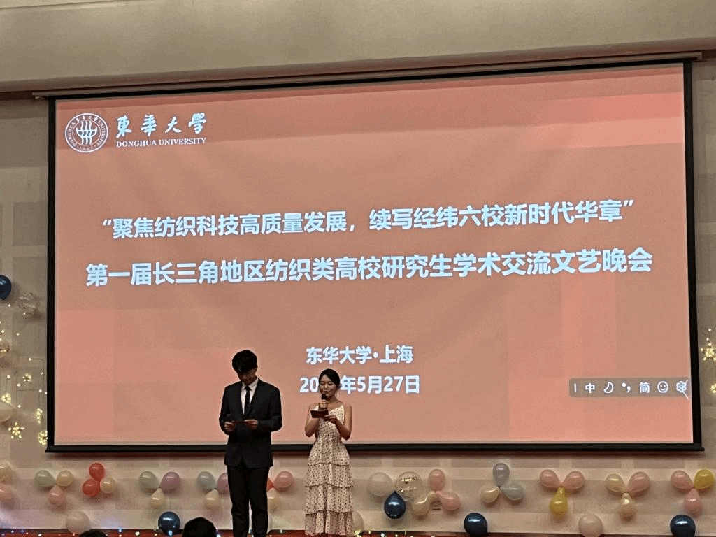 方平在欢迎会上致辞,他介绍了学院“知识赋能、实践启能、文化塑能、协同增能”的矩阵式研究生学术精神培养模式以及“5个一”为主干的学术文化育人举措,受到与会师生的一致首肯。在之后的研究生工作专题研讨会上,学院教师代表围绕“聚焦民族复兴大任,培育时代新人”进行经验交流,达成了诸多一致性意见。期间,师生代表还饶有兴致参观东华大学校史馆与纺织学院一流学科展示厅,感受东华大学的深厚底蕴与纺织的新时代新发展。下午,六所院校的师生分别在图文信息中心第三会议室和第四会议室进行学术交流活动。来自六校的24名学生代表分别展示“纺织新材料”和“纺织新技术”成果,我校黄程玲和陈亮2位同学分别就自己的研究现状为大家做了精心的汇报。傍晚,“锦绣年华·织圆行方”研究生文化交流文艺晚会在东华大学图文信息中心举办,此次晚会由6个学院的研究生带来,分为破冰、暖融、沸腾三个环节,节目形式多样,街舞、歌曲演唱、魔术以及相声,为大家带来了一场视听盛宴,也增强了文化交流。