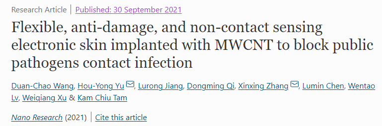 余厚咏特聘教授课题组在国产顶级期刊Nano Research连续发表两篇研究论文。其中《Flexible, anti-damage, and non-contact sensing electronic skin implanted with MWCNT to block public pathogens contact infection》工作是通过与四川大学张新星教授等学者在材料、纺织、信息等学科交叉融合而成,余厚咏特聘教授为通讯作者,博士研究生王端超为第一作者;在《Versatile sensing devices for self-driven designated therapy based on robust breathable composite films》中,余厚咏特聘教授为论文唯一通讯作者,硕士研究生欧阳兆锋为第一作者,上述成果进入“挑战杯国赛”决赛中。