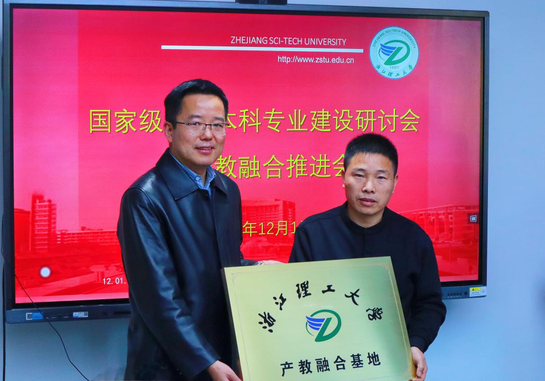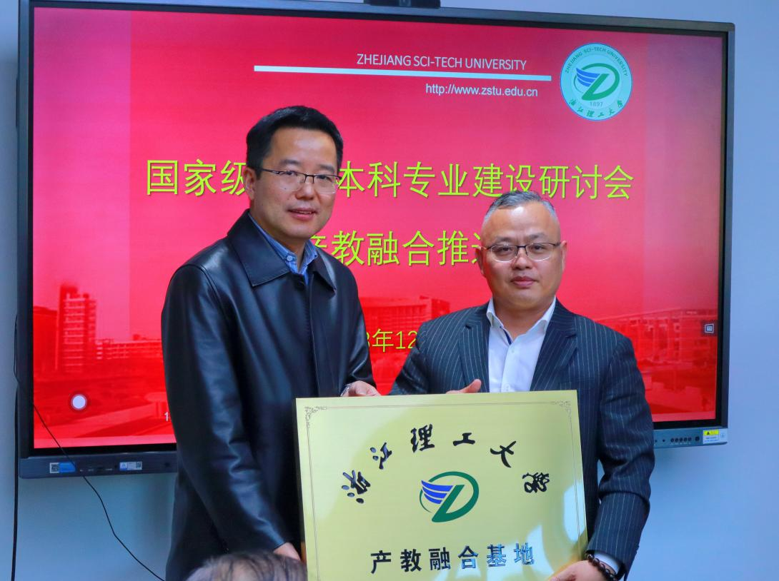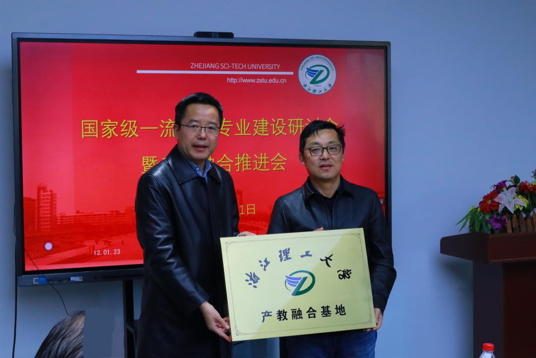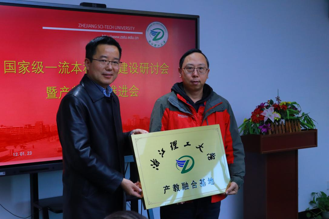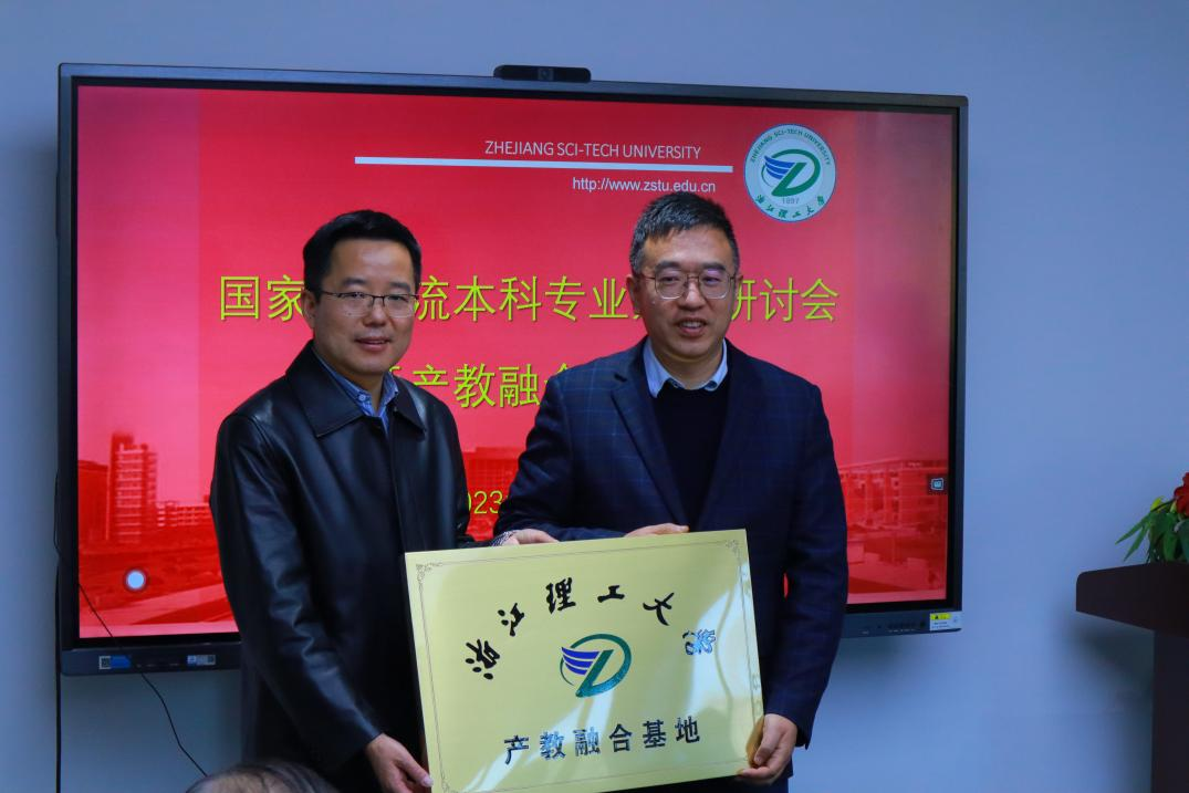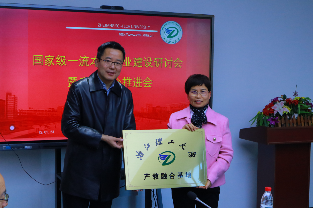 会议第二部分为产教融合推进会。会上,王尧骏处长为浙江理工大学产教融合基地授牌。浙江古纤道绿色纤维有限公司总经理马建平,桐昆集团股份有限公司总工程师孙燕琳,浙江棒杰数码针织品有限公司董事长陶建伟,诺华(杭州)纺织有限公司董事长王雪柯,浙江集点科技有限公司董事长蒋增成,杭州经纬计算机系统工程有限公司董事长刘洋飞,义乌华鼎锦纶股份有限公司办公室主任张雪华参加了授牌仪式。