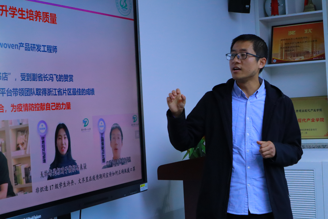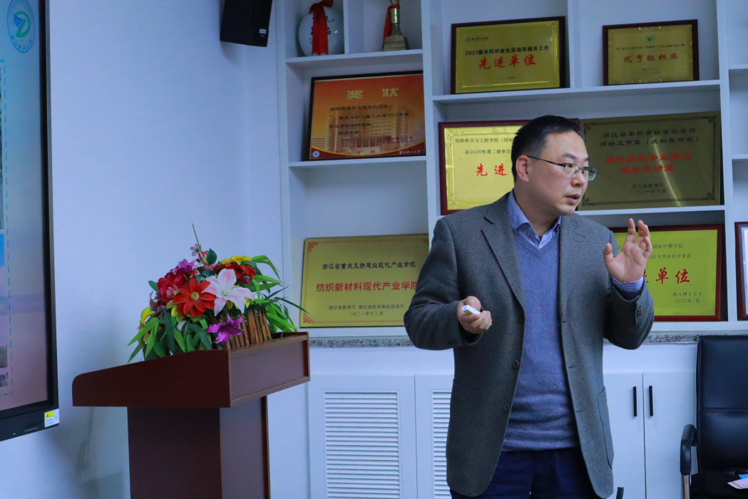 金子敏教授汇报校级产业学院——数智现代纺织产业学院建设情况。他介绍产业学院通过建立政产学研协同发展的共同体,发挥数字化纺织产业优势,深化产教融合,重点在纺织品数字化设计、纺织装备互联互通、纺织企业数字化管理、数字化智能化纺织产品开发等领域,培养数字化纺织产业需要的高素质应用型、复合型、创新型人才。