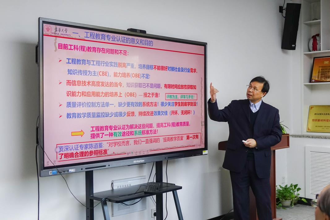 郭建生教授做《工程教育专业认证的意义及主线底线》主旨报告。他在报告中指出,工程教育专业认证为解决工程教育与工程行业实践脱离、教育教学质量监控缺少等问题,提供了一种有效途径和系统标准方法。并且分析通过工程教育专业认证,建立面向产出的(OBE模式)教学体系,有效运行培养目标、毕业要求、课程体系等合理性和达成评价机制。