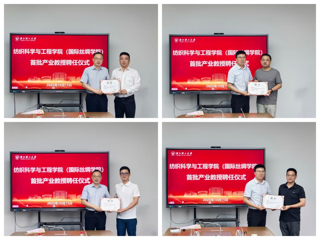 在庄重而热烈的气氛中,于斌和杨徽共同为到场的四位产业教授:叶福忠、董洪波、张军锋、房涛荣逐一颁发了聘书。四位产业教授的加入,将为拥有128年办学历史的纺织学院(丝绸学院)注入珍贵的“产业基因”。