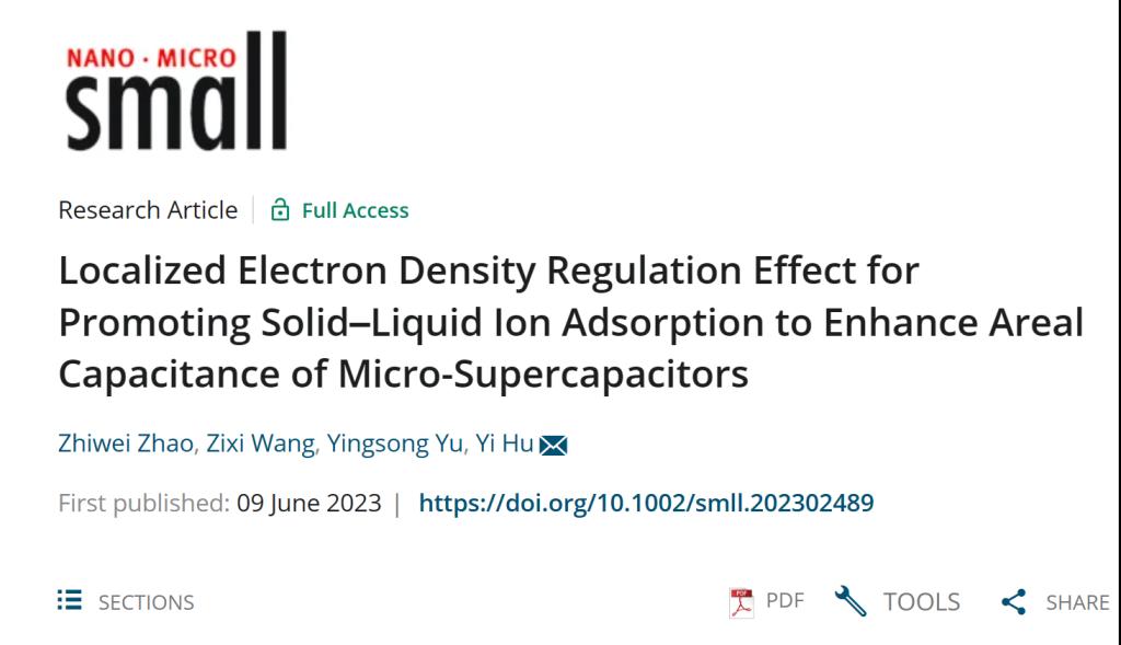 鉴于此,浙江理工大学纺织科学与工程学院轻化工程系博士生导师胡毅教授课题组报道了利用染整技术中局部电子增强对于染料分子的强化吸附作用机理,通过分步水热法将边缘具有丰富含氧官能团型石墨烯量子点均匀沉积在高导电石墨纸上,结合激光裁切技术制备图案化平面微型储能器件的策略,从电子定域函数(ELF)的拓扑分析和电子密度的角度研究了GQDs的局域电子结构。计算结果显示GQDs结构电子密度具有分布不均匀特性。全碳基柔性GP/GQDs微型超级电容器表现出超高的面积电容(21.78 mF cm-2),以及超长的循环寿命(25000次循环后容量保持率为86.74%),且表现出优异的机械柔性、耐弯曲性以及集成性能。相关工作以“Localized Electron Density Regulation Effect for Promoting Solid–Liquid Ion Adsorption to Enhance Areal Capacitance of Micro-Supercapacitors”为题发表在国际著名期刊Small上,影响因子15.153,DOI:10.1002/smll.202302489。