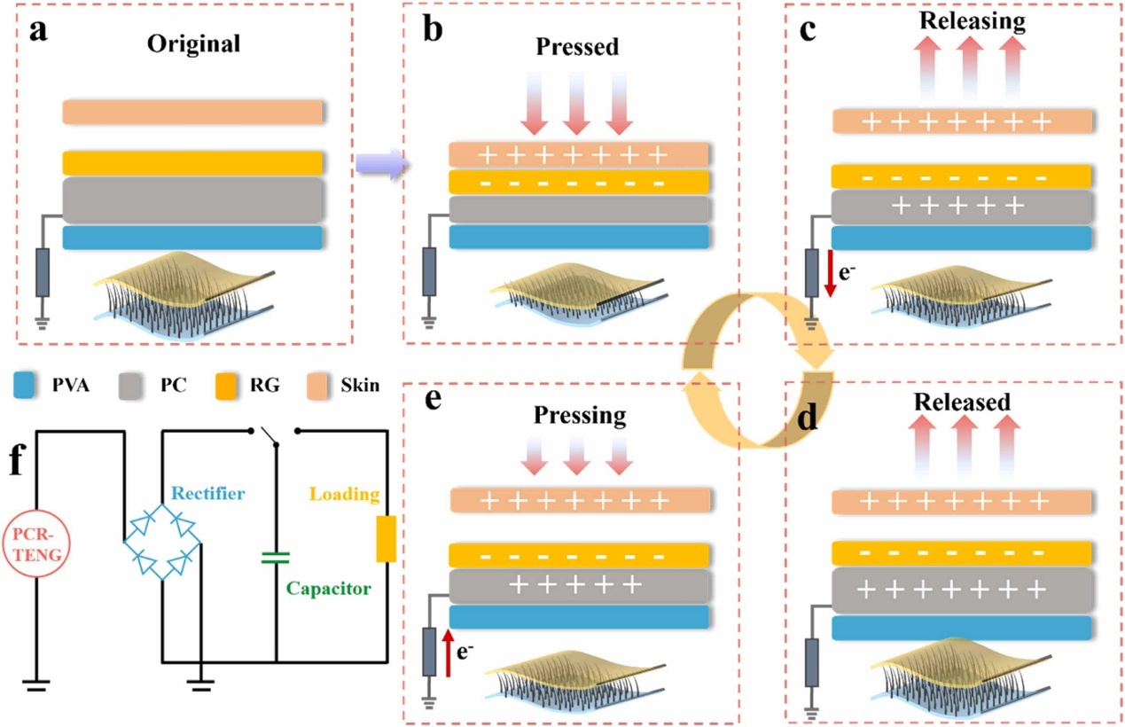 RG膜具有很强的吸引电子的能力,是PCR-TENG理想的摩擦负极材料,人体皮肤通常被用作便携式可穿戴设备的摩擦正极材料。初始状态下,人体皮肤与RG膜未接触时不存在电位差。当皮肤在人体压力作用下与RG薄膜充分接触时,由于RG膜高的电子亲和性,电子很容易从皮肤表面转移到RG薄膜表面,从而在皮肤上产生正电荷,在RG膜上产生相等的负电荷。释放压力时,由于静电感应,自由电子通过外部负载从PC纱线电极流向大地,PC纱线电极产生正电荷,输出电信号。然后,当皮肤与RG膜完全分离时,RG薄膜表面的负电荷与PC电极产生的正电荷完全平衡,达到静电平衡,无电信号输出。当皮肤再次接近RG膜时,之前的静电平衡被打破,PC纱线电极中的正电荷被从大地流入的自由电子中和,输出相反的电信号。当皮肤再次完全接触RG膜时,电荷平衡状态恢复。在外部持续压力作用下,皮肤和RG膜之间的接触-分离过程将不断循环,输出稳定连续的交流电压和直流电流信号。