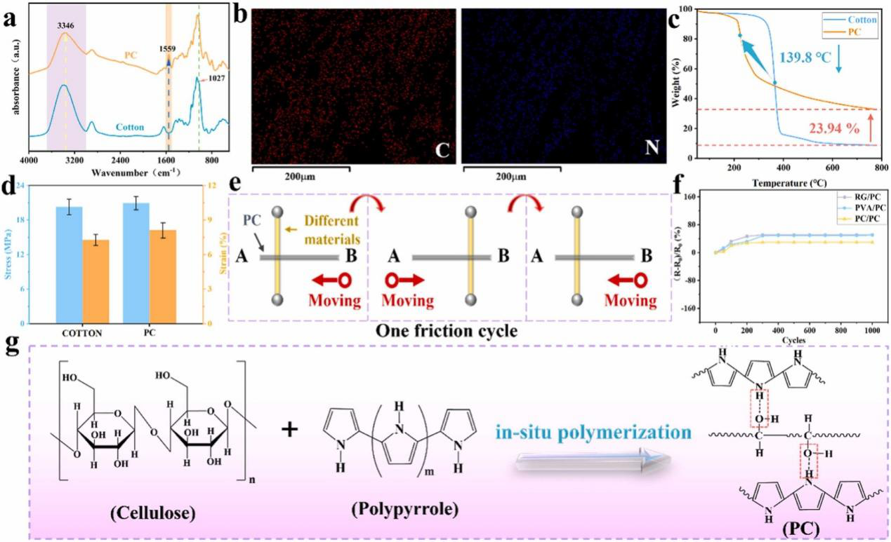 通过傅立叶变换红外光谱(FTIR)来确定加入吡咯前后棉纱线结构的变化。结果表明,在PC纱线的光谱中发现了导电PPy粒子的特征峰,包括1559 cm-1处的吡咯环振动和1027 cm-1 处的C-H面内振动。这些光谱变化表明,PPy主要通过氢键和静电作用与棉纱线的大分子链相互作用,从而形成稳定的导电复合纱线。此外,PC纱线最大热降解温度(Tmax)从365.2 ℃降至225.4 ℃。这是因为PPy导电纳米粒子首先在高温下降解,然后形成阻燃层,从而抑制棉纱内部进一步分解。此外,PC纱线的机械性能相比于纯棉纱线也略有改善。