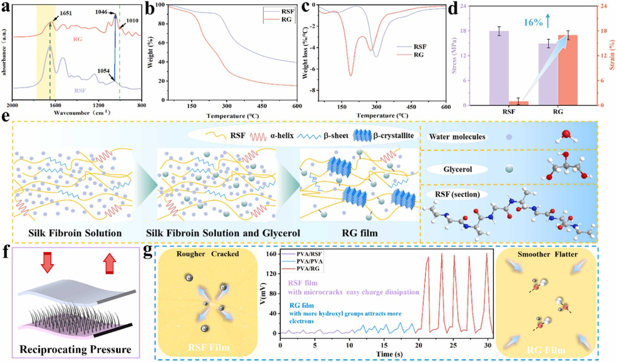 FTIR用于进一步研究RG膜的形成和分子结构特性。与RSF膜相比,RG膜在3000-3800 cm-1处的峰值变宽,表明甘油的加入增强了薄膜的保水性和氢键作用。此外,由于甘油的增塑作用,RG膜的热稳定性和强度与RSF膜相比略有下降,但韧性显著提高。从甘油分子在RG薄膜中的作用机理来看,甘油分子可与丝素大分子间形成氢键,破坏了丝素大分子链之间的分子间相互作用,显著增强了丝素大分子链的可移动性,进一步诱导薄膜中有序结构域的形成。