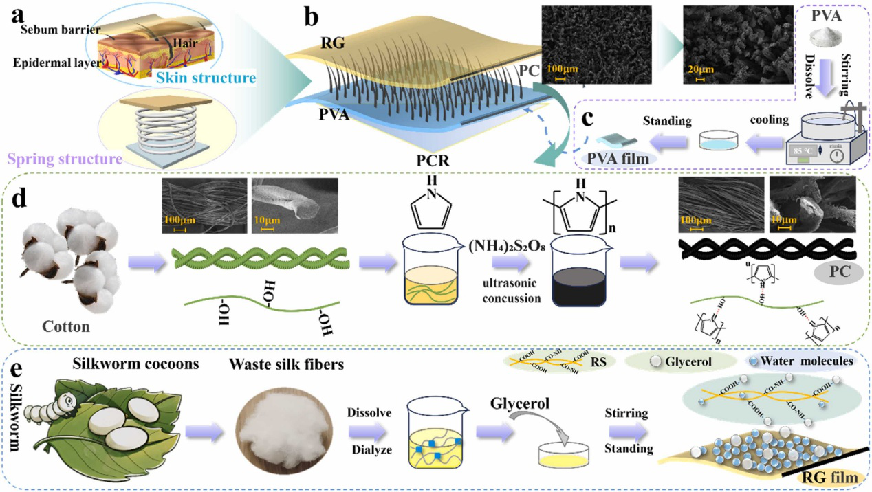 本研究受人体皮肤皮脂层-毛发-表皮层结构的启发,通过3D结构设计成功构筑了单电极摩擦纳米发电机PCR-TENG。PCR-TENG由甘油增 塑的丝素蛋白(RG)薄膜作为摩擦层材料,导电复合棉(PC)纱线与PVA薄膜作为外电路电极材料组成。其中双向生长的、具有仿弹簧结构的PC弹性纱线层具有优异的导电性,而用甘油增塑的RG薄膜作为摩擦负极材料具有优异的电负性和柔韧性。