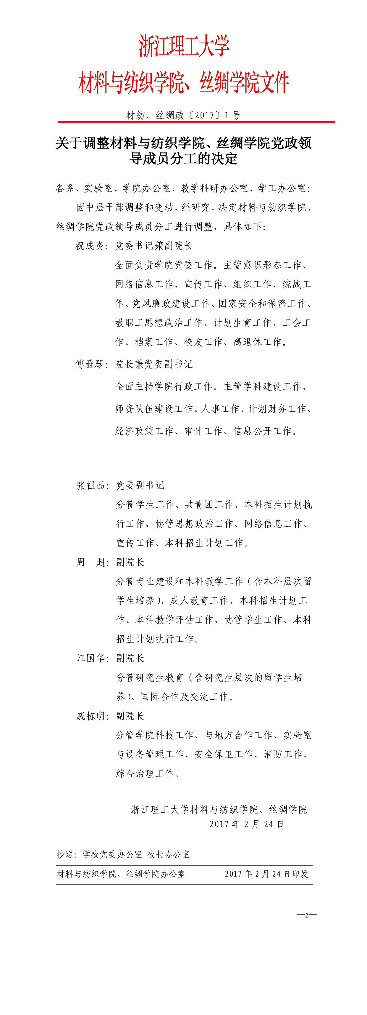 关于调整材料与纺织学院、丝绸学院党政领导成员分工的决定