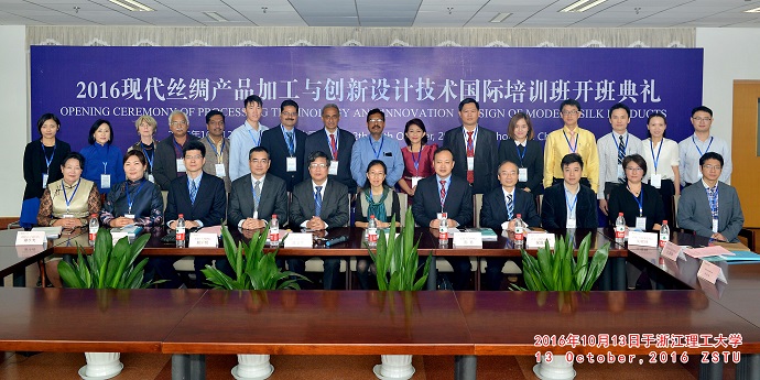 2016年10月13日,由科技部国际合作司主办、中国科学技术交流中心组织实施、浙江理工大学承办、国际丝绸联盟协办的“现代丝绸产品加工与创新设计技术国际培训班”在我校举行开班典礼。科技部国际合作司综合与计划处处长庄嘉、浙江省科技厅国际科技合作处副处长陈勇、浙江理工大学副校长陈文华,以及我校科技处、材料与纺织学院、丝绸学院相关领导和教师代表出席了开班典礼。开班典礼由材料与纺织学院副院长郑今欢主持。