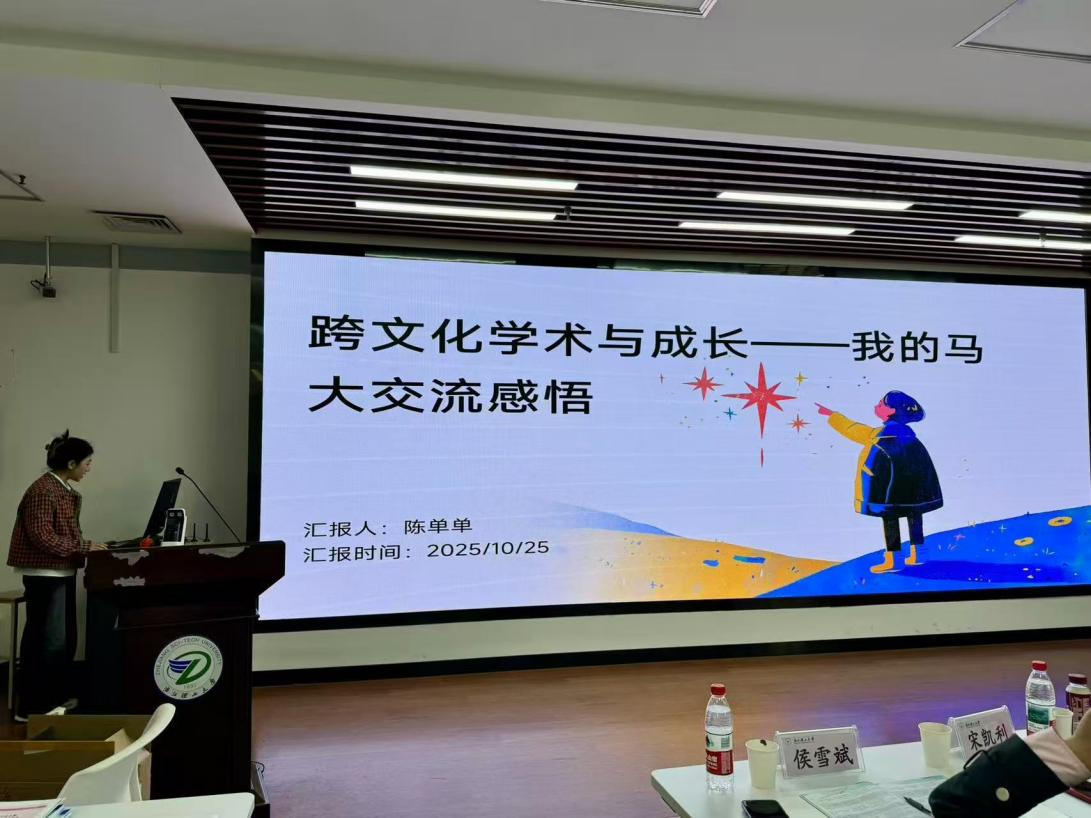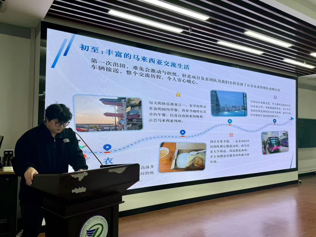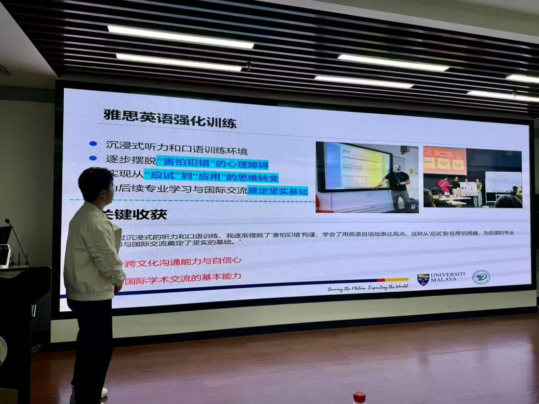 表彰环节过后,进入2025马来亚大学交流项目总结会环节。三个月项目的硕士生李智宇、一个月项目本科生梁晶晶及硕士生余夏杰分别就马来亚大学的语言环境、风土人情及成长蜕变等方面做了分享。