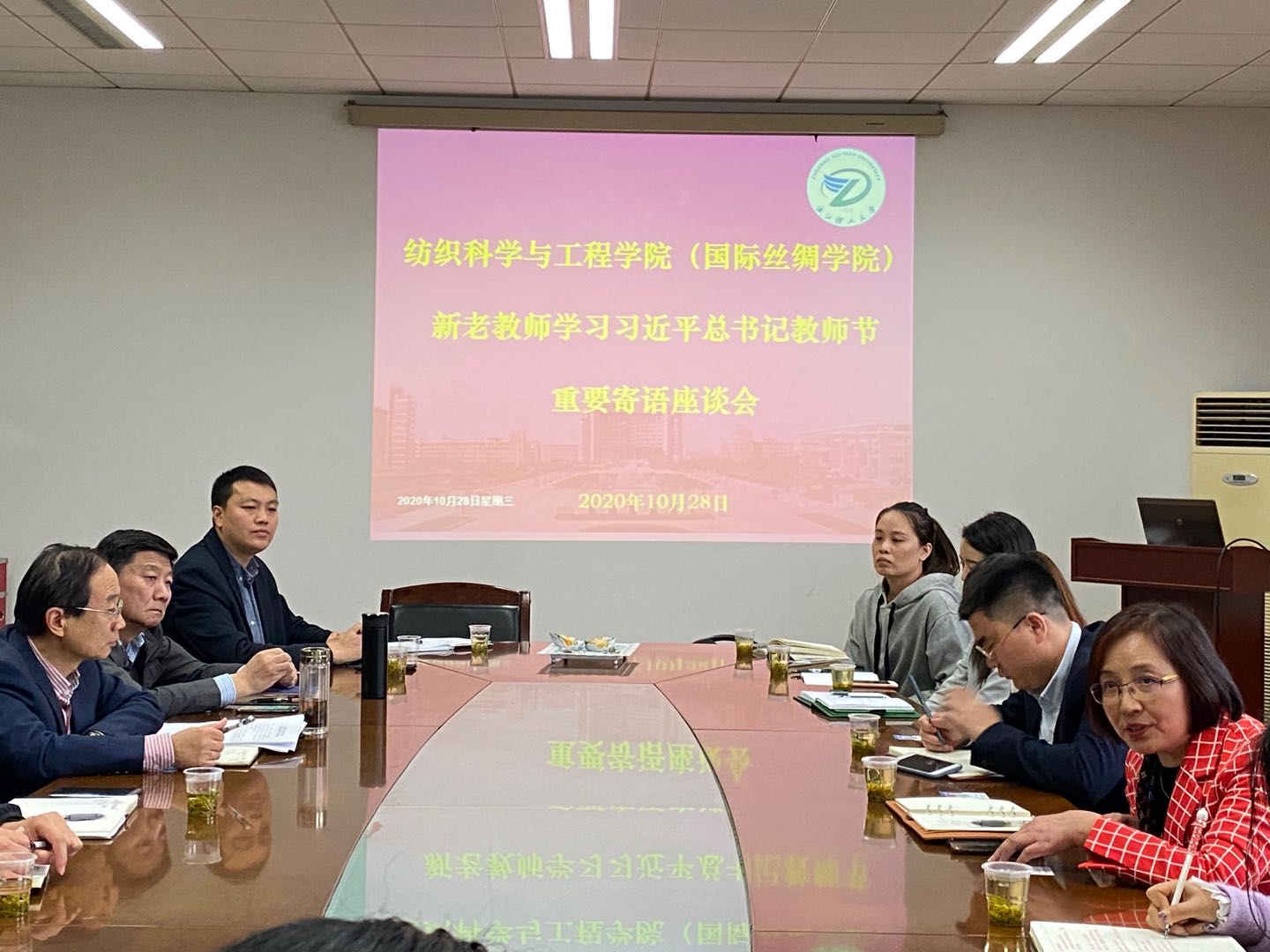 在学院312会议室召开了新老教师学习习近平总书记教师节重要寄语精神座谈会。学院党委书记和副书记、办公室主任、优秀教师代表、2020年新进校教师、纺织工程系教师党员参加了座谈会。会议由“全国高校党建工作样板党支部”纺织工程系教工党支部承办,支部书记杜平凡教授主持。