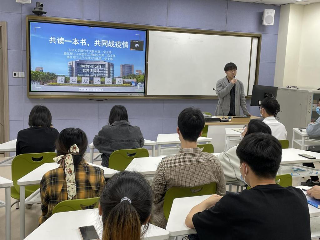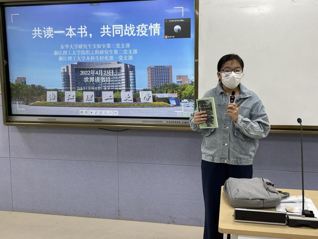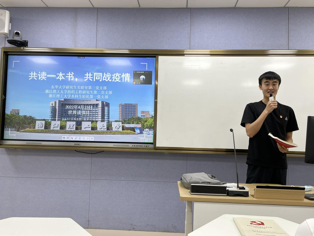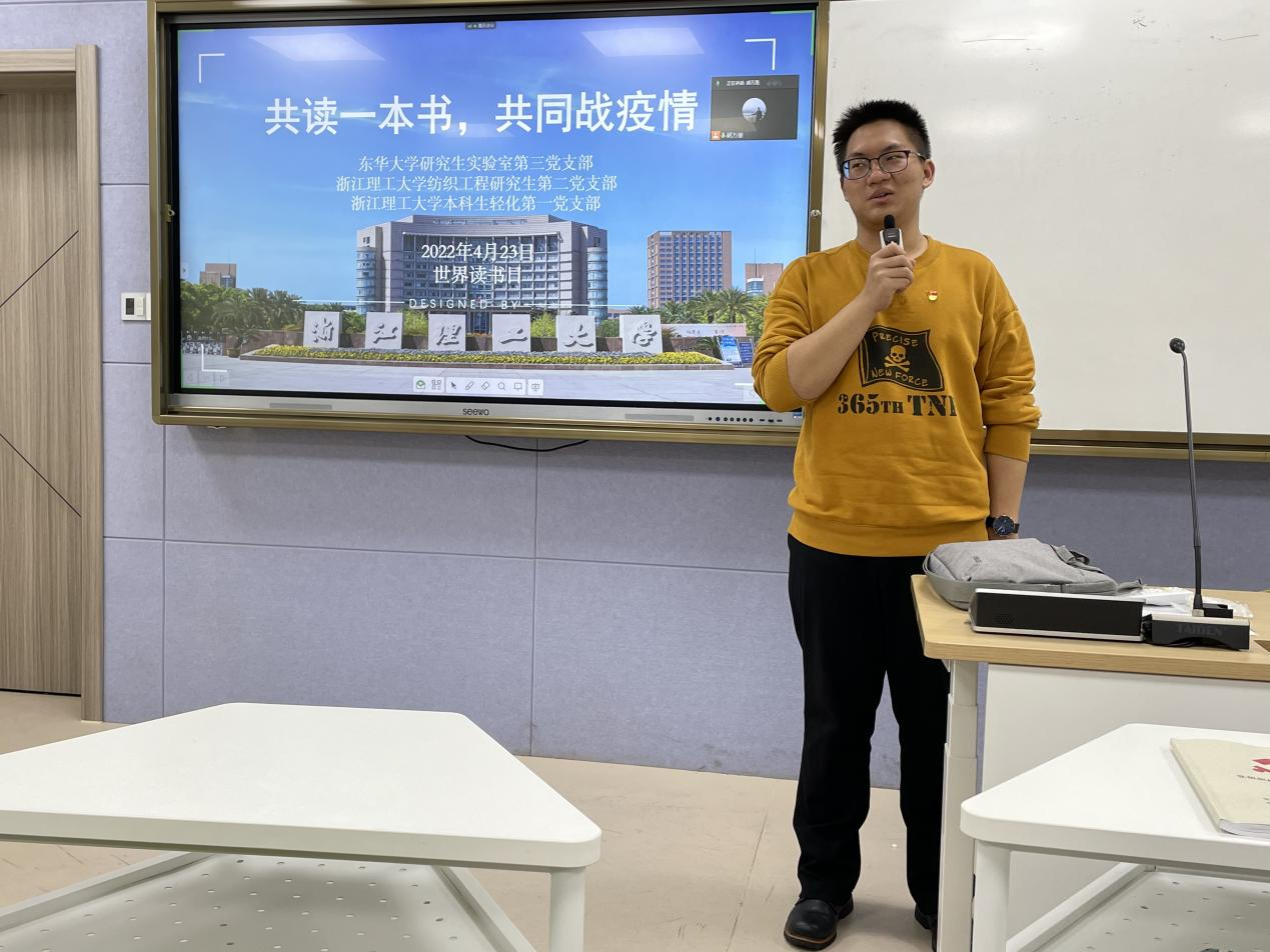 为更好地塑造全民阅读的校园氛围、激发纺织学子的学习热情和文化渴求,发挥好纺织(丝绸)学院“学术红人”的科研助力和红心引领的“传帮带”作用,引导双方高校的党员青年共享精神食粮,凝聚抗疫力量。在阅读中赓续红色根脉,在交流中传承红色基因。4月23日世界读书日来临之际,纺织(丝绸)学院与东华大学化工学院在线上举行“攻读一本书,共同战疫情”线上读书分享会。纺织(丝绸)学院研究生纺织工程系第二党支部、本科生轻化第一党支部和东华大学化工学院实验室第三党支部的党员代表参加本次分享会。会议由纺织(丝绸)学院研究生纺织工程系第二党支部书记胡万里主持。