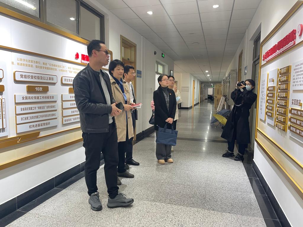 会前,方平在学院3楼党建“双创”长廊介绍了学院在党建双创工作的经验与成效,“10个有”所形成党建思政文化给邵月花一行留下深刻印象。